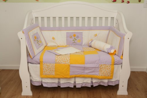 A combination of HANDMADE "FUXICO" YO-YO flowers appliquéd in PATCHWORK, and embroidered appliqués to bumpers. 6 pieces CRIB set all in white soft luxury crisp Pique, except fitted sheet. BUMPERS' ties and band edge in fine soft solid color cotton zippered all around with removable filler for easy wash. QUILT can be in PATCHWORK (shown) or in white soft Pique cotton with lavender band edge of fine cotton. EMBROIDERED PILLOW SHAM and bow tie ROLL. Pleated luxury soft white Pique 12" crib SKIRT. Fine solid color cotton FITTED SHEET. A special beauty for a precious little girl. Machine wash on delicate cycle in cold water. No chlorine. Tumble dry. ACCESSORIES: CURTAIN set or EMBROIDERED VALANCE only, matching HAND-embroidered CHANGING PAD, HAND-KNOTTED fine shag daisy RUG.